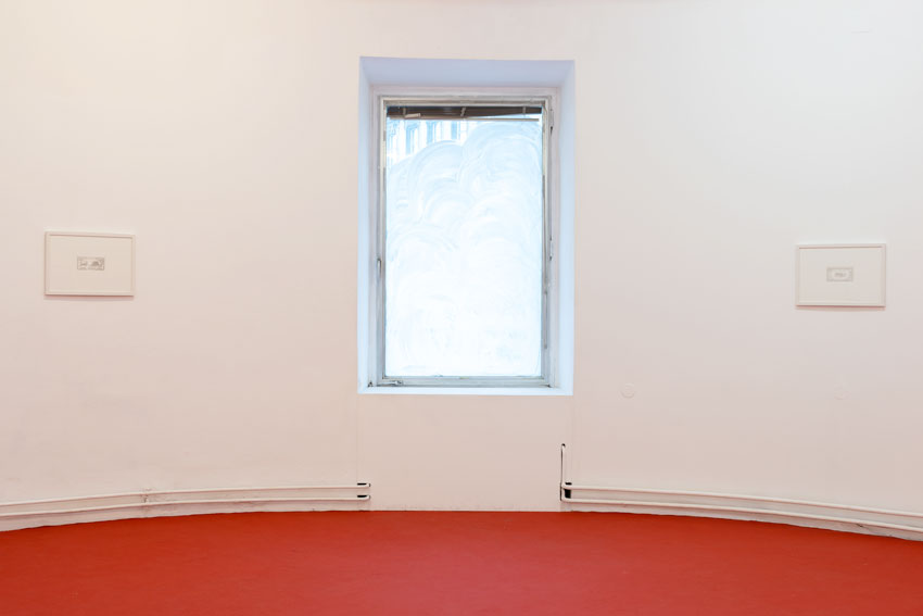 Infine, le tre finestre dello spazio circolare di DAS WEISSE HAUS, affacciate su un incrocio di Vienna, sono state rivestite con una pellicola bianca semi-opaca concepita per attenuare la vista del paesaggio urbano e sospendere ogni contatto visivo con la città, pur consentendo il passaggio della luce naturale: Nuvole.