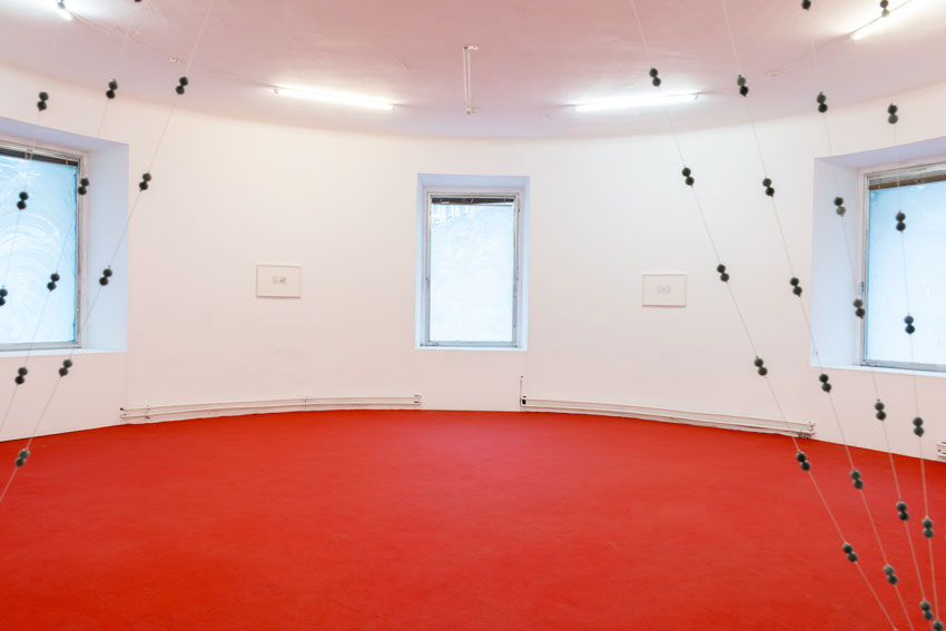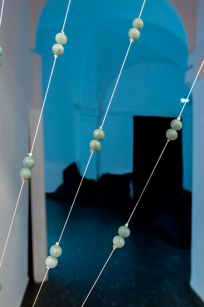 Sulla soglia che separa la prima stanza, dedicata al video, dalla seconda sala si trova Miao Yin, un’installazione composta da perle di giada, un rimando all’Imperatore di Giada, suprema divinità celeste del pantheon taoista, tradizionalmente raffigurata sul fronte delle Hell Bank Notes.