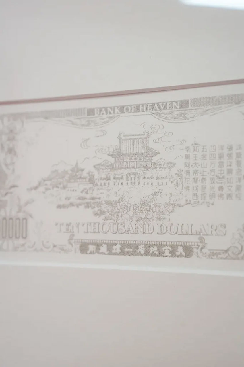 A portion of the ashes produced by burning the three million dollars in Joss Paper was used to create the screenprint series Currency for the Otherworld. The series explores the iconography of votive banknotes: the prints reproduce the reverse sides of the traditional Joss Paper, showing views of divine residences and the so-called “banks of the afterlife” — places where, according to tradition, souls receive the money burned by the living.