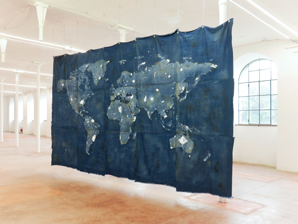 World Map (about sustainable fashion) starts from a reflection on the imbalances in economic and political relations at an environmental level. Ryts Monet has chosen the image of the planisphere made by decrease, wearing down and consuming a denim fabric support until the image of an exhausted Earth was generated, reduced to shreds.